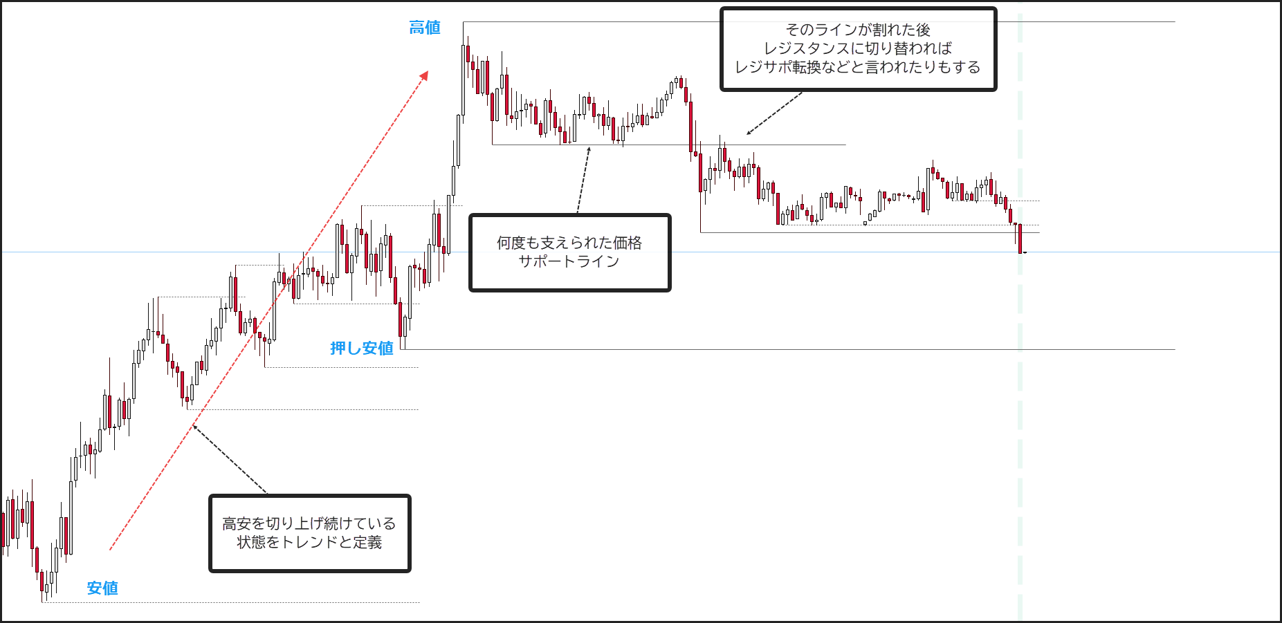 可視化された上下運動の情報には、いろいろな定義を定めることができます。例えば下記チャートでは、誰もが当たり前のように考えている「高値」や「安値」、それらが切り上げ続けている状態を「トレンド」だとか、何度も意識されて留まっていた価格や価格帯を「抵抗線(レジスタンス)」や「支持線(サポート)」などと言ったり、トレンドの安値を「押し安値」などと呼称したりすることです。他、ダブルトップやダブルボトム、三尊やフラッグなどの有名なパターンも、誰かが定義し広まったものですよね。